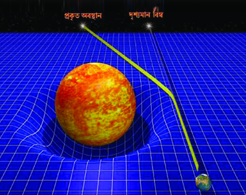 যাই হোক, বিশাল ভরের বস্তু কর্তৃক স্থান-কাল লক্ষুীয়ভাবে বেঁকে যায় বলেই নক্ষত্রদের চারদিকে গ্রহদের আর গ্রহদের চারপাশে উপগ্রহের কক্ষপথ তৈরি হয়। কিন্তু কোনো বস্তু স্থান এবং কালকে বাঁকিয়ে দেয়- এটা বললেই কি মানতে হবে? এর সপক্ষে প্রমাণওতো থাকতে হবে। বলাই বাহুল্য, প্রাচীনকালে প্রদত্ত বিভিন্ন বৈজ্ঞানিক (বা অবৈজ্ঞানিক) তত্ত্বের তুলনায় আপেক্ষিকতাকে অনেক বেশিই পরীক্ষা দিতে হয়েছিল। সাধারণ আপেক্ষিকতার ভাষ্য মতে, ভর যেহেতু স্থান কালকে বাঁকিয়ে দেয়, সেহেতু বড় বড় ভরের বস্তুদের লেন্সের মতো আচরণ করা উচিত। অর্থাৎ, ধরো, আমরা কোনো নক্ষত্রের পেছনে অবস্থিত অন্য কোন বস্তু দেখতে চাই। কিন্তু সাধারণ অবস্থায় সেই বস্তুকে দেখা না গেলেও মাঝখানের বস্তুটি যেহেতু স্থানকে বাঁকিয়ে দেবে, তাই অপরপাশের বস্তু থেকে আসা আলো সেই বক্রপথ অনুসরণ করে দর্শকের চোখে ধরা পড়বে। প্রমাণিত হবার পর এখন এই ঘটনাকে বলা হয় গ্র্যাভিটেশনাল লেন্সিং।