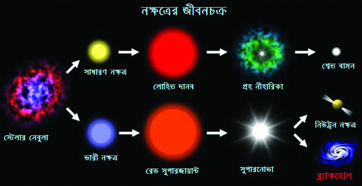 গত সংখ্যায় আমরা ব্ল্যাকহোলের সাথে প্রাথমিক পরিচিতি সেরেছিলাম। এবার আমরা দেখবো, কিভাবে জন্ম নেয় এই দানবেরা। ব্ল্যাকহোল আবার আছে তিন রকমের- স্টেলার বা নাক্ষত্রিক (Steller), Supermassive বা অতি ভারী ও খুবই ছোট্ট আকারের মাইক্রো বা মিনিয়েচার ব্ল্যাকহোল (Miniature Black Hole)। আজকে আমরা মূলত প্রথম ধরনের তথা স্টেলার ব্ল্যাকহোল নিয়েই জানবো। এদের জন্ম হয় একটি নক্ষত্রের জীবনের শেষের দিকে, যখন এর সবটুকু জ্বালানি নিঃশেষ হয়ে যায়। এই ধরনের ব্ল্যাকহোল যেহেতু একটি নক্ষত্রের জীবনের অন্তিম দশা, তাই এর জন্মলাভের উপায় জানতে হলে নক্ষত্রের জীবনচক্র বুঝতে হবে। আমাদের তাহলে বুঝতে হবে একটি নক্ষত্রের জন্ম হয় কিভাবে। জন্মের পরে এর মধ্যে কী ঘটতে থাকে? কিভাবে এটি আলো, তাপ ও বিকিরণের মাধ্যমে এর শক্তির বহিঃপ্রকাশ করে হুঙ্কার ছাড়ে, কিভাবে এটি আস্তে আস্তে বার্ধক্যে উপনীত হয় এবং মারা যায়।