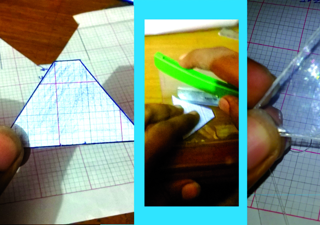 - ২. এবার গ্রাফ পেপারে অঙ্কিত ট্রাপিজিয়ামটি কেটে নাও। এবার এই ট্রাপিজিয়াম পেপার আকারের মত করে সিডি কভার এর স্বচ্ছ অংশ থেকে করে চারটি ট্রাপিজিয়াম অংশ কেটে নাও।