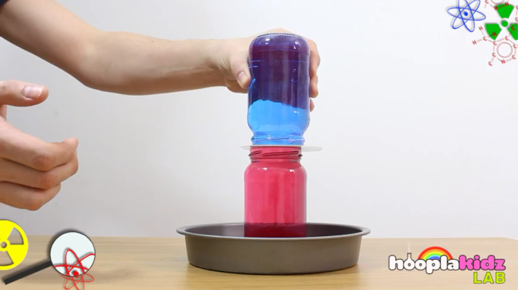 এবার গরম পানির জারকে নিচে রেখে ঠাণ্ডা পানির জারের উপর প্ল্যাস্টিক কার্ড দিয়ে তা উল্টিয়ে গরম পানির জারের উপরে রাখ।