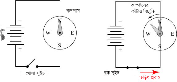ছবির বর্তনী যখন খোলা (সুইচ অফ) তখন কম্পাস কাঁটা ঠিক অবস্থানে আছে। ঠিক পাশের ছবিতে বর্তনী বদ্ধ (সুইচ অন) করা আছে। অর্থাৎ, তড়িৎ প্রবাহিত হচ্ছে বলে কম্পাস কাঁটা তার অবস্থান থেকে সরে যাচ্ছে। সহজ কথায় বললে তারের ভেতর দিয়ে যখন বিদ্যুৎ প্রবাহিত তখন তারের চারপাশে নিচের চিত্রের মত করে চুম্বকক্ষেত্রের সৃষ্টি হয়।