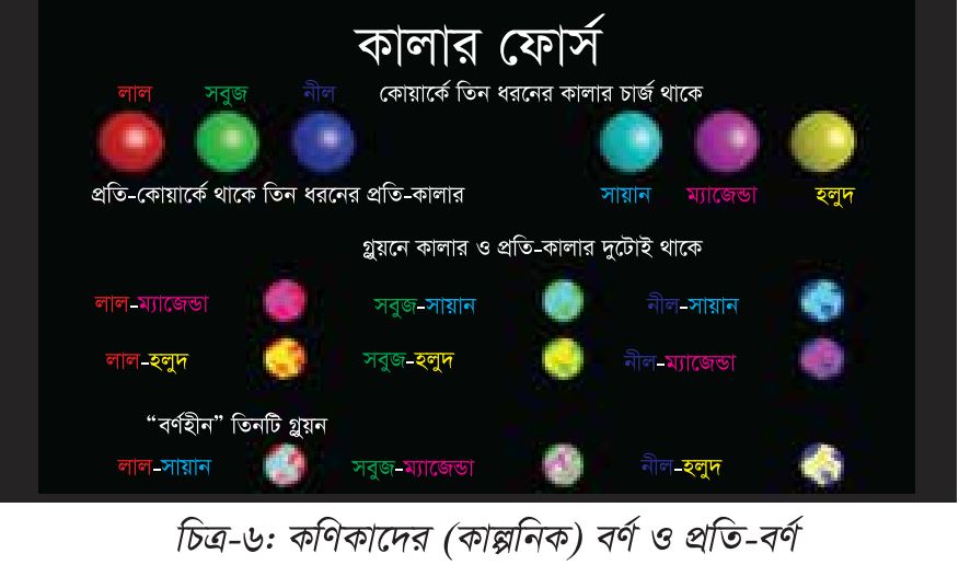 যেমন– একটি লাল, একটি সবুজ অথবা একটি নীল যা প্রোটন ও নিউট্রনে দেখা যায়। আবার, একটি কোয়ার্ক ও একটি অ্যান্টিকোয়ার্ক একত্রে থাকতে পারে। যেমন– মেসন কণা একটি রেড ও একটি অ্যান্টি রেড কোয়ার্ক নিয়ে গঠিত। কোয়ার্কগুলোকে এমন রঙের সাথে তুলনা করার আসল মজাটা এখানেই।