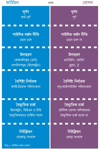 অপরদিকে, লেপটন নামক ফার্মিওন সবল নিউক্লিয় বল সংবেদী নয়। লেপটন এবং ফার্মিওন – উভয়ের দলেই আবার একাধিক মৌলিক কণিকা রয়েছে। এখানেই শেষ নয়। বোসনেরও দুটি ভাগ আছে। কিন্তু এখানে একটি বড় রকমের ভারসাম্যহীনতাও রয়েছে। আমরা প্রায় যতগুলো বোসনকে চিনি তার সবই গেজ বোসন। এ বোসনগুলো বল বহন করতে পারে। গেজ বোসন বলতে সে কণাগুলোকেই বোঝায় যেগুলো মহাকর্ষ, তড়িচ্চৌম্বকত্ব, দুর্বল এবং সবল নিউক্লিয় বলকে বহন করে। বোসনের অপর রকমফেরটি হল হিগস বোসন। অসাধারণ কিছু যুক্তি বিবেচনায় এটি স্ট্যান্ডার্ড মডেলে বিশেষ স্থান দখল করে আছে।