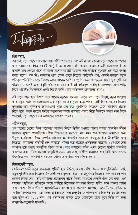 শুরুতেই নতুন বছরের আরোরা রাঙা বর্ণিল শুভেচ্ছা। এবং অভিনন্দন। কেননা নতুন বছরে পদার্পণের জন্য তোমাদের বিগত বছরটি পাড়ি দিতে হয়েছে। যদি আমরা আমাদের এই যাত্রাপথের দিকে তাকাই তবে দেখতে পাবো আমাদের অনেক সহযাত্রী প্রিয়জন আর পরিচিত মুখেরাই এই যাত্রা সম্পন্ন করার সুযোগ পান নি। করোনার থাবা যেমন কেড়ে নিয়েছে অর্ধকোটি প্রাণ, তেমনি করোনা উদ্বৃত প্রতিকূল পরিস্থিতি কেড়ে নিয়েছে আরো অনেক বেশি। সম্প্রতি কেবল আত্মহত্যা আর সড়ক দূর্ঘটনার খতিয়ান দেখলেই তার কিছুটা আঁচ করা যায়। তাই এই প্রতিকূল পরিস্থিতি সাফল্যের সাথে পাড়ি দিতে পারাটাও নিঃসন্দেহে একটি বিরাট অর্জন। তাই অভিনন্দন তোমাদের প্রাপ্য।