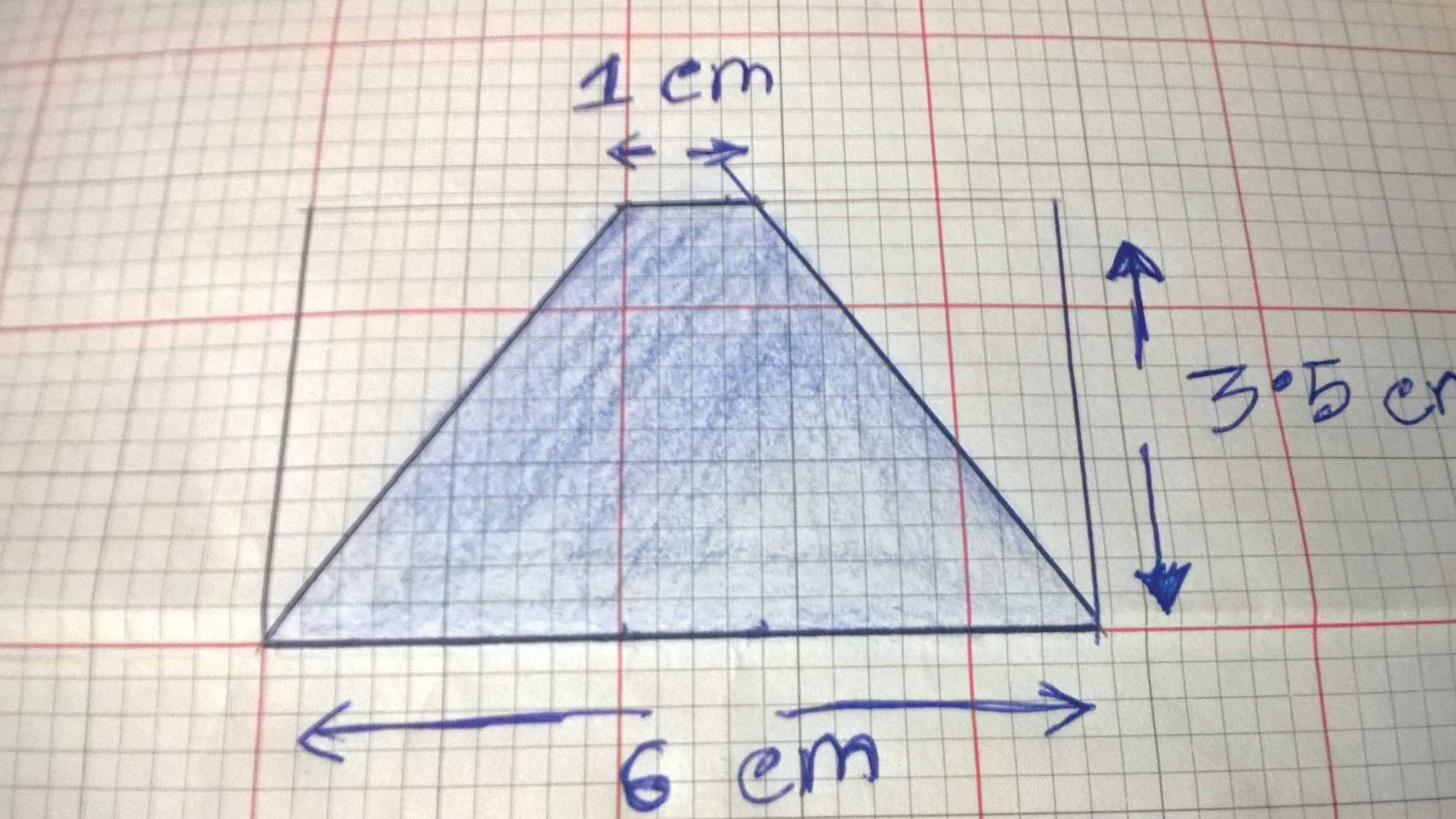 - ১. প্রথমে গ্রাফ পেপারে কলম ও স্কেল দিয়ে চিত্রের মত করে একটি ট্রাপিজিয়াম আঁকো। (ট্রাপিজিয়ামটির ভূমি ৬ সেমিঃ, ওপরের বাহু ১ সেমিঃ এবং উচ্চতা ৩.৫ সেমিঃ হতে হবে।)