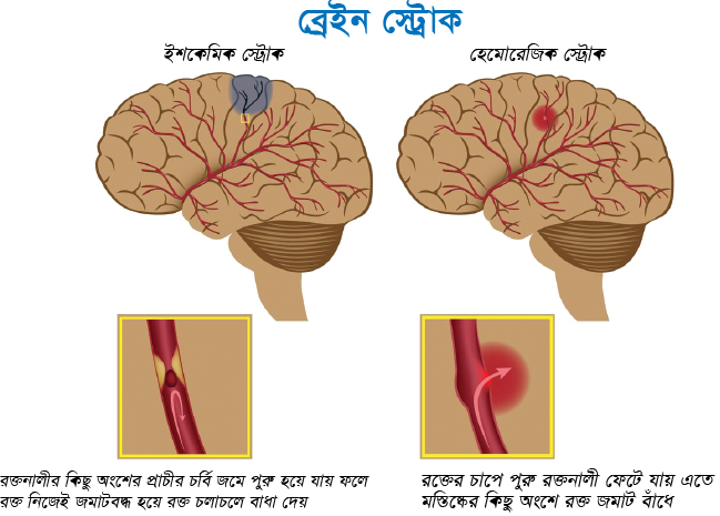 প্রথম ধরনের রোগই বেশি লোকের হয়। এতে মারা যায় কম, কিন্তু যাদের হয় তাদের হাত পা অবশ থাকে দীর্ঘদিন। কথা জড়িয়ে জড়িয়ে বলে। একে বলে ইশকেমিক স্ট্রোক। মাথার রক্তবঞ্চিত হওয়া স্ট্রোক।