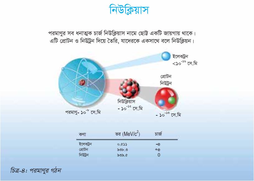 এমন ঘটনার মূল কারণ হল ক্ষুদ্রতর আরও কিছু কণার সমন্বয়ে নিউক্লিয়াস গঠিত হয় যাদের আমরা নিউক্লিয়ন বলি। নিউক্লিয়ন বলতে মূলত প্রোটন আর নিউট্রনকে বোঝানো হয়। প্রতিটি কণার সাথে বৈদ্যুতিক আধান (Electric Charge) বিজড়িত। প্রোটন হল ধনাত্মক আধানযুক্ত কণা। আর ইলেকট্রন হল ঋণাত্মক আধানযুক্ত কণা।