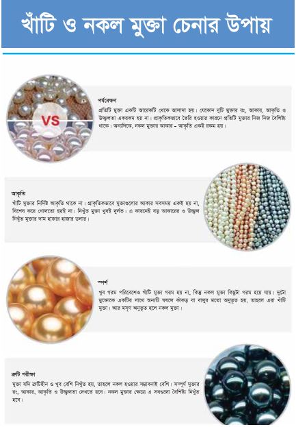 পর্যবেক্ষণে দেখা গেছে, লোনাপানির মুক্তা অপেক্ষাকৃত বেশি উন্নতমানের হয়। তবে আজকের বাজারে যেসব কৃত্রিম মুক্তা বিক্রি হয় তার বেশিরভাগই স্বাদুপানির মুক্তা। নকল মুক্তা তৈরি হয় কাচ থেকে। এক্স-রের সাহায্যে আণবিক গঠন পরীক্ষা-নিরীক্ষা করার মাধ্যমে প্রাকৃতিক মুক্তা থেকে কৃত্রিম মুক্তার পার্থক্য নির্ণয় করা হয়। নকল মুক্তা আর আসল মুক্তা খুব সহজেই চেনা যায়। আসল মুক্তার তুলনায় নকল মুক্তার উজ্জ্বলতা অনেক কম থাকে। মুক্তার মান নির্ভর করে করে এর উজ্জ্বলতা, আকার-আকৃতি, রঙ প্রভৃতির উপর। মুক্তার বাইরের পৃষ্ঠের আলোর প্রতিফলন, প্রতিসরণ ও বিচ্ছুরণের ক্ষমতা থেকে মুক্তার উজ্জ্বলতা বোঝা যায়।